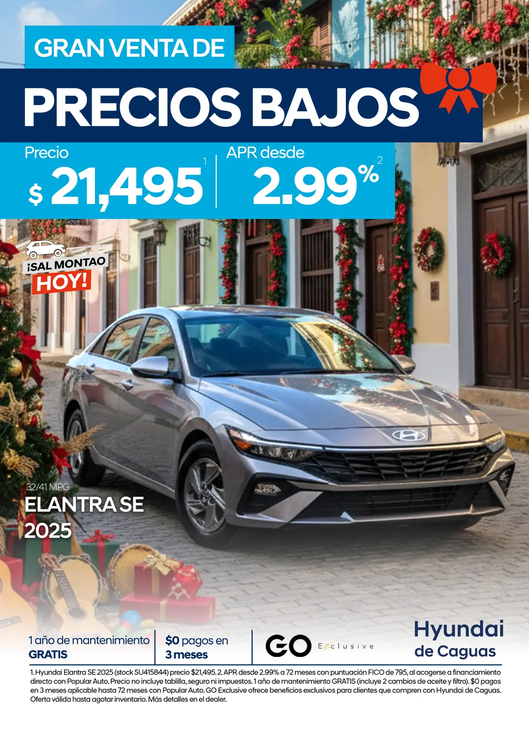 [2] 1. Elantra SE 2025 (stock SU415844) precio $21,495. 2. APR desde 2.99% a 72 meses con puntuación FICO de 795, al acogerse a financiamiento directo con Popular Auto. Precio no incluye tablilla, seguro ni impuestos. 1 año de mantenimiento GRATIS (incluye 2 cambios de aceite y filtro). $0 pagos en 3 meses aplicable hasta 72 meses con Popular Auto. GO Exclusive ofrece beneficios exclusivos para clientes que compren con Hyundai de Caguas. Oferta válida hasta agotar inventario. Más detalles en el dealer.