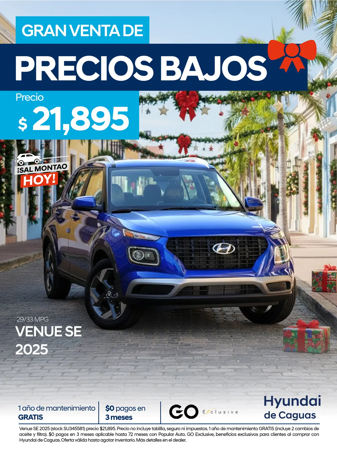 [1] Venue SE 2025 (stock SU345581) precio $21,895. Precio no incluye tablilla, seguro ni impuestos. 1 año de mantenimiento GRATIS (incluye 2 cambios de aceite y filtro). $0 pagos en 3 meses aplicable hasta 72 meses con Popular Auto. GO Exclusive, beneficios exclusivos para clientes al comprar con Hyundai de Caguas. Oferta válida hasta agotar inventario. Más detalles en el dealer.